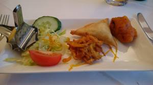 The mixed starter – Onion Bhaji, lamb samosa and a pakora