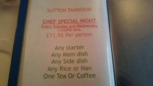 The Sutton tandoori seemed to do acceptable/passable Indian food for a reasonable price. If the promotion was not on then I cant say I would recommend it to anyone coming from outside Sutton, but on a Tuesday and Wednesday nights then I would say its good value for money.