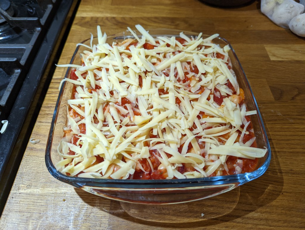 Add to a baking tray and sprinkle a layer of cheese.