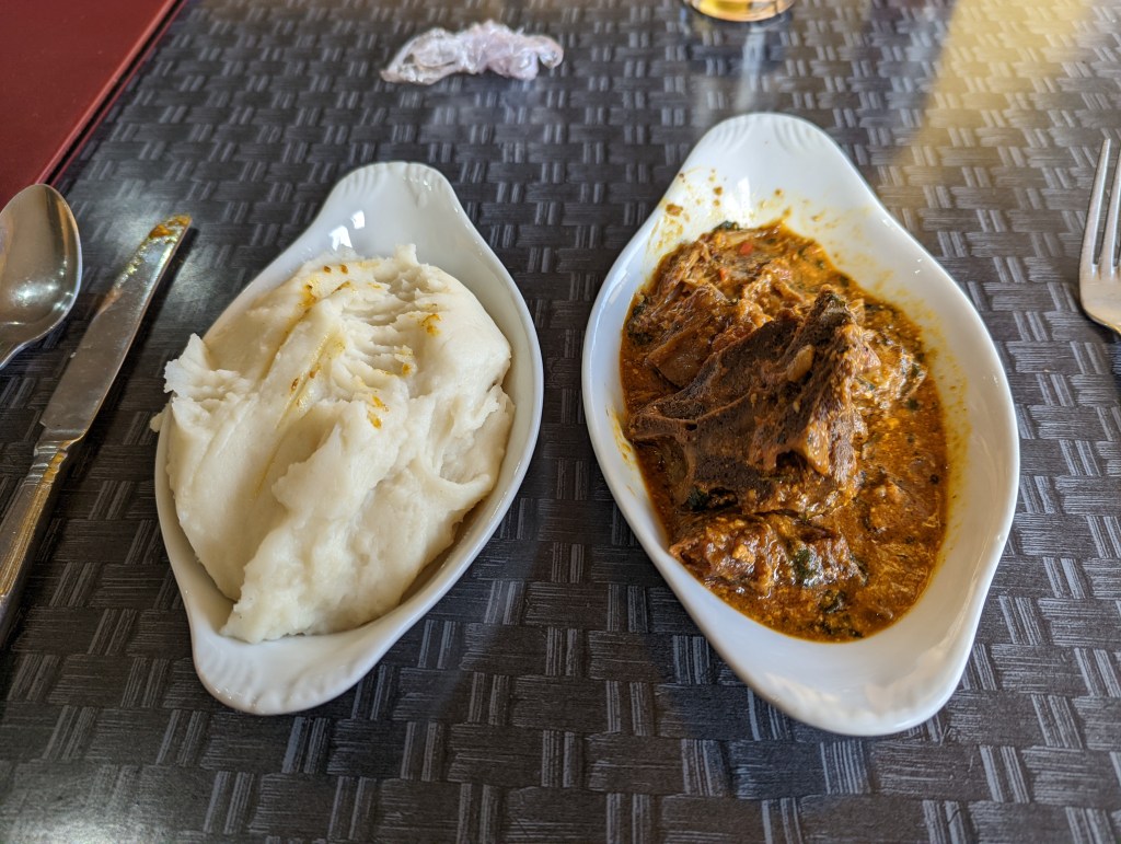 There are a good selection of dishes on the menu. Most of it I was unfamiliar with, which was great for people like me always looking to try something new. Luckily there were pictures which helped me navigate the menu and gave me clues to what sort of things to expect. The staff were very helpful and explained the food and which dishes are good for pairing. I noticed Ogbono Soup, which I was warned had a very strong taste and may be a bit much for someone unfamiliar with it…so naturally I had to try it!