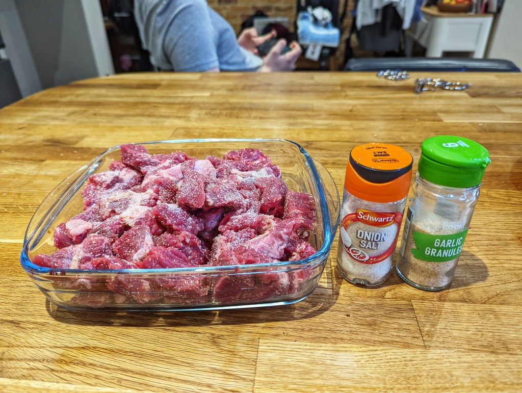 I cut the brisket up into cubes and covered them in garlic and onion salt. I then placed the diced brisket into a dish and put it to one side.