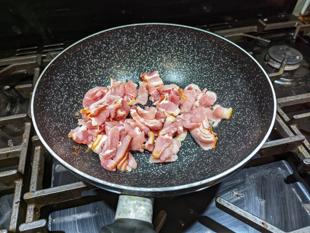 I chopped the bacon into small pieces and fried it all with a very small amount of oil. I fried the bacon until it was crispy and had got most of the fat out of the rations. I then took the bacon out and left as much oil in the pan as I could. The reason for this was to fry the onions and garlic in the oil to give them a smokey flavour.