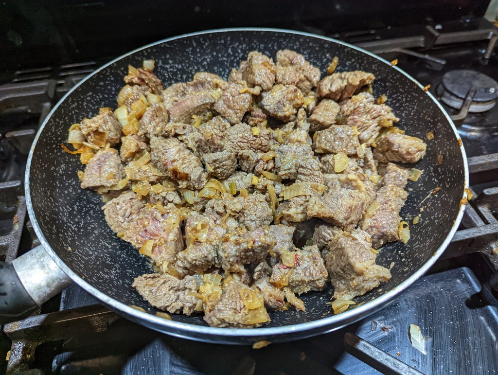 I then added the chopped brisket covered in garlic and onion salt, which I prepared earlier.