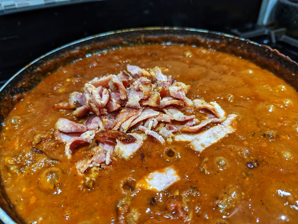 Once the chopped tomatoes are thoroughly cooked through, add the bacon from earlier. Stir them in then let them cook into the dish for a few minutes.