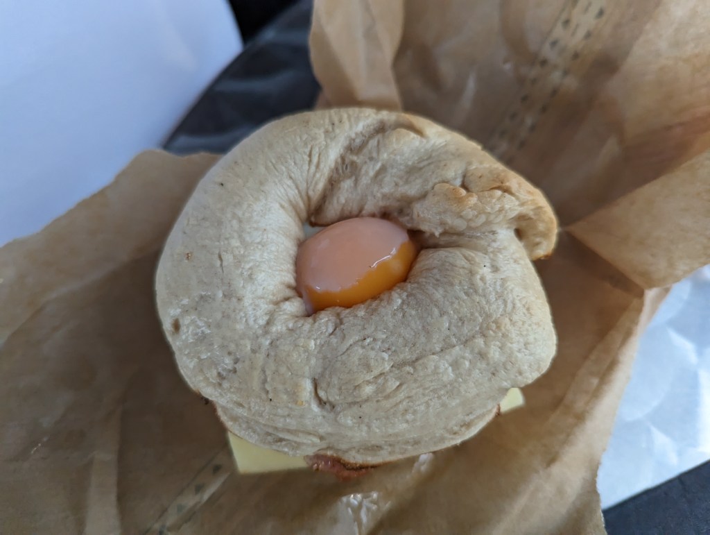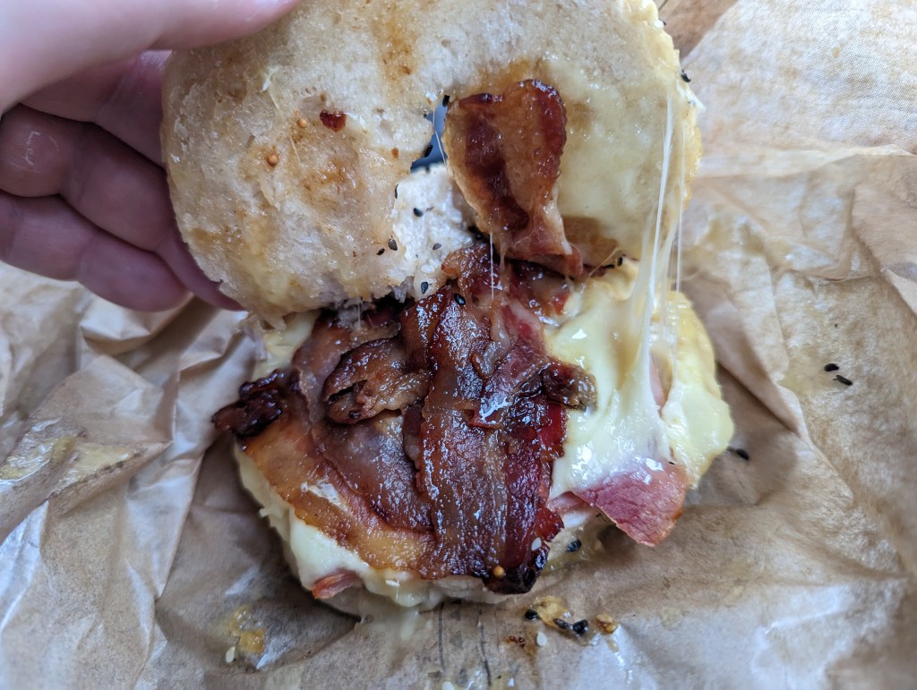 My wife went for the “big easy” which consists of sausage, bacon, Gouda cheese, and a “local” fried egg. This came to £6.50.