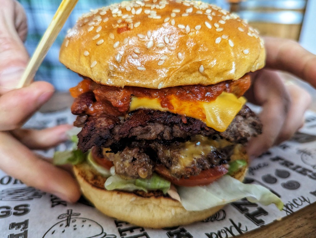 We ordered the ‘Spicy American’ and ‘The Cheesy Pig’, both coming to £12 each. Both were double burgers which really embraced the American style portions…in other words, they were bloody huge! They reminded me of the gargantuan burgers from Holy Burger in St Ives. You certainly won’t leave feeling hungry here!