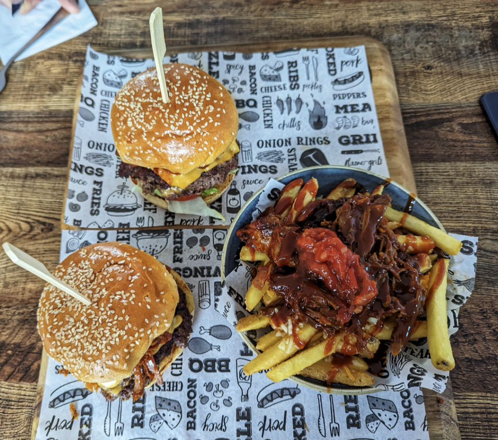 My friend and I decided to split a burger each, with some loaded fries to share. The food came out in good time and was served on a board.