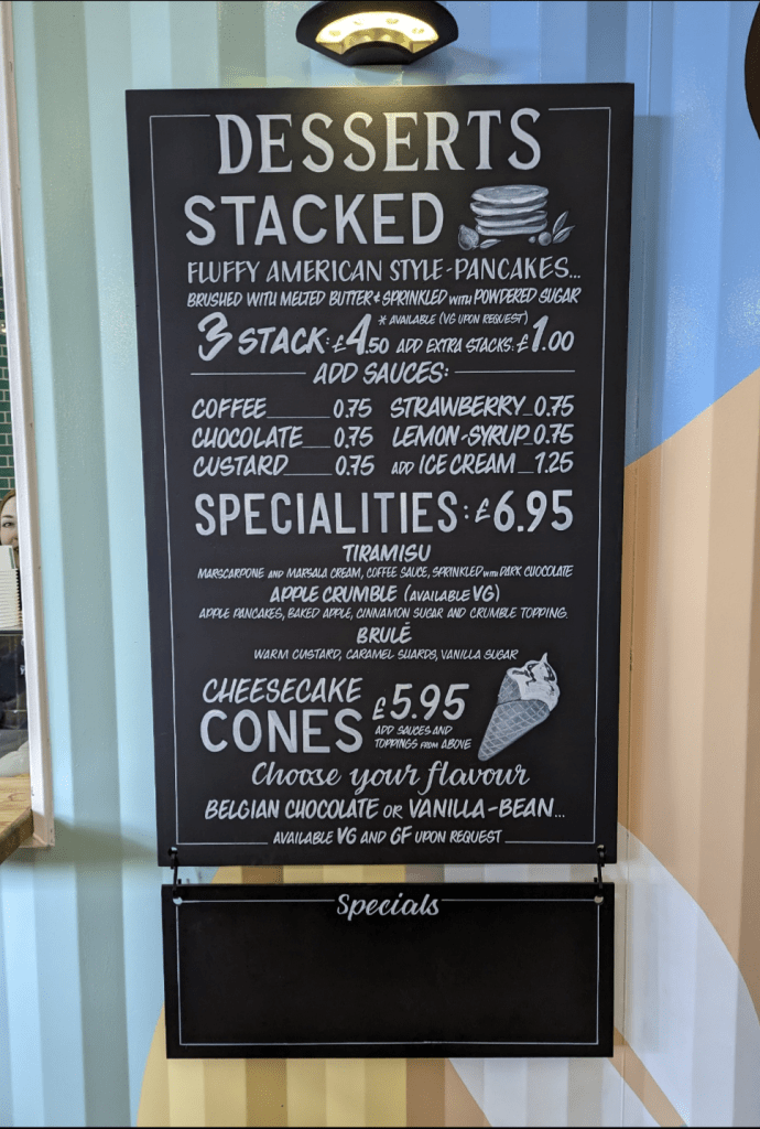 My wife decided to go for some dessert, so naturally this gave me an excuse to have some too without feeling guilty. There was a choice between dessert cones, American style pancakes, and specials like tiramisu and apple crumble. Unfortunately, the tiramisu and apple crumble were not available at the time. There were also gluten free and vegan options available.