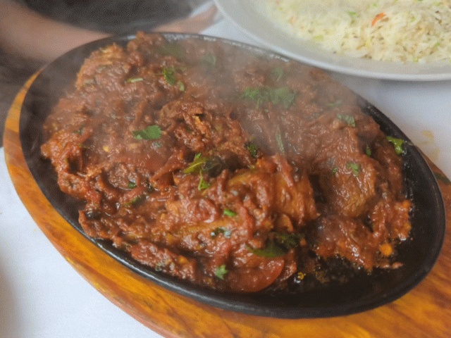 My son is starting to get to the age where he is exploring the menu more often and moving away from his usual chicken tikka masala, so he picked out this blinding dish called the ‘Lamb Visal’. This is lamb neck fillet, slow cooked, in a thick onion sauce with ginger, garlic, and curry leaf. All on a noisy and very exciting sizzling platter. What’s not to love for a 12 year old?