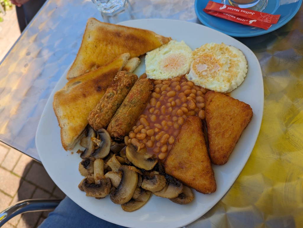 My mum enjoyed her vegetarian cooked breakfast. This was very similar to my breakfast but instead had meat free sausages, hash browns and mushrooms instead of bacon. Her eggs were slightly better prepared than mine, so I was likely unlucky.