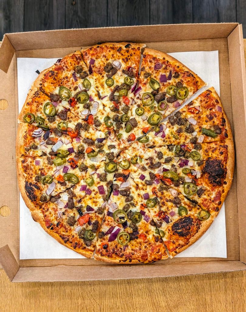 A good value and balanced bricked-baked pizza, cooked at 290 degrees. Quality ingredients, well sized, with generous toppings.