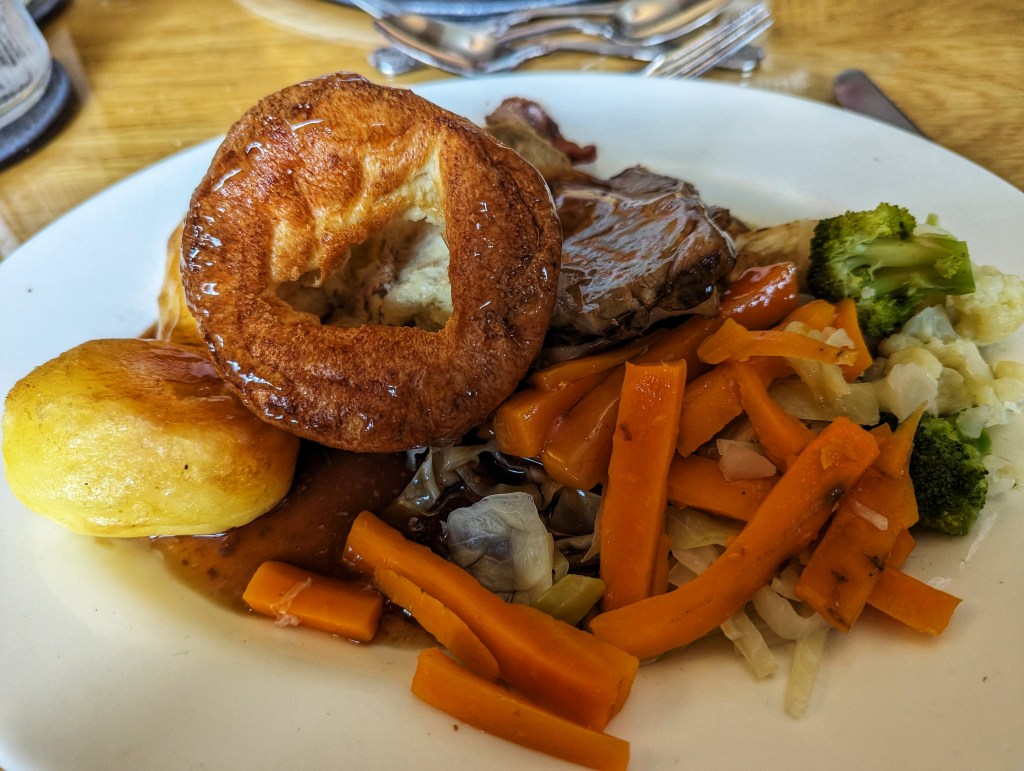 I had the mixed roast dinner. The place was rammed even for a Sunday afternoon but the food came out in good time. The staff did a great job with managing the huge numbers of people out today. The roast was accompanied with broccoli, carrots, cabbage, potatoes, and a yorkie.