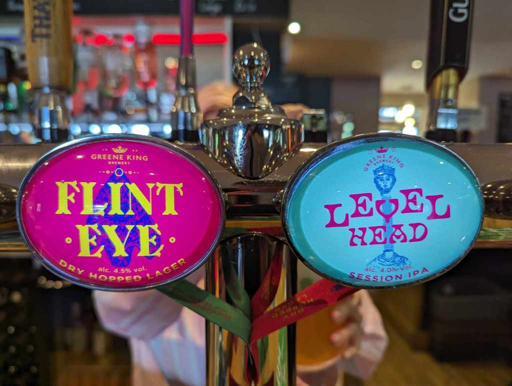 The pub is Greene King, so the beer selection is not going to blow anyone away but I was pleased to see ‘Flint Eye’, a dry hopped lager and ‘Level Head’ a sessionable IPA. I quite like Level Head so decided to go for a pint which came to £5.