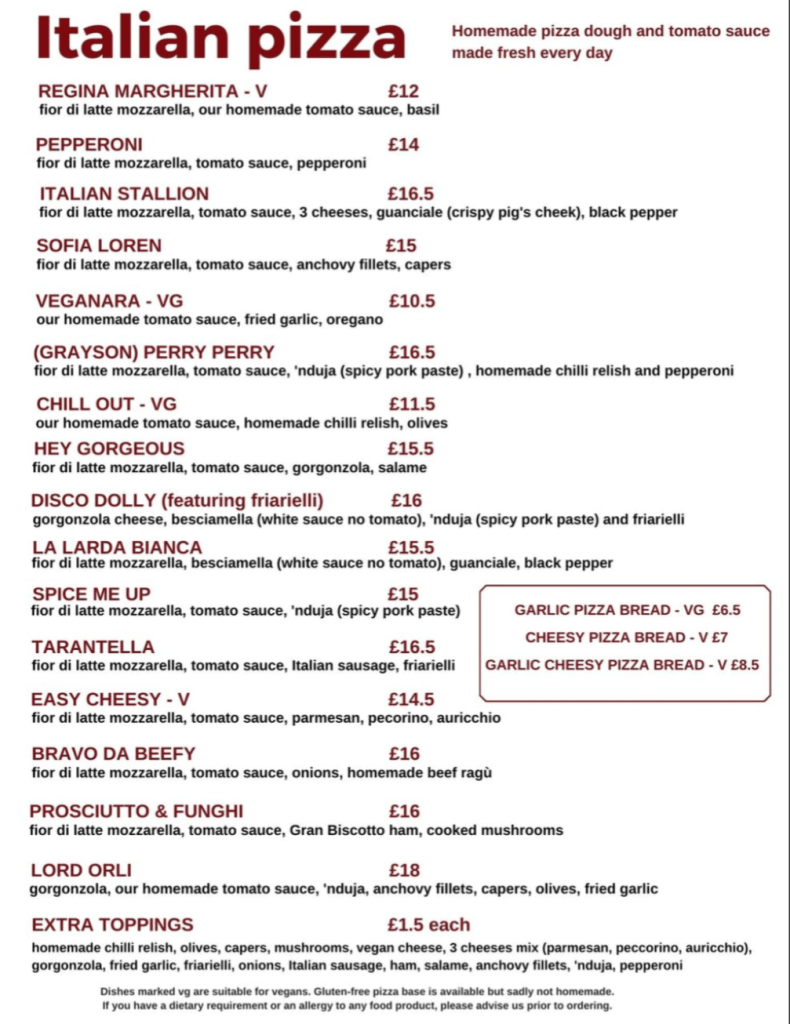 Pizzas hover between £12-18 with most of them in the £15-16.50 area. This puts them at around the average price for a pizza on Mill Road. Gluten free pizzas are available but they are not home made.