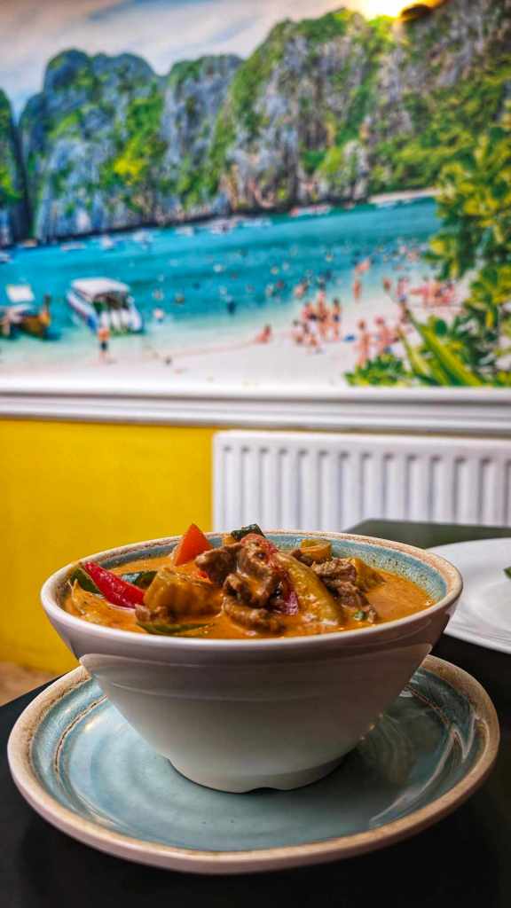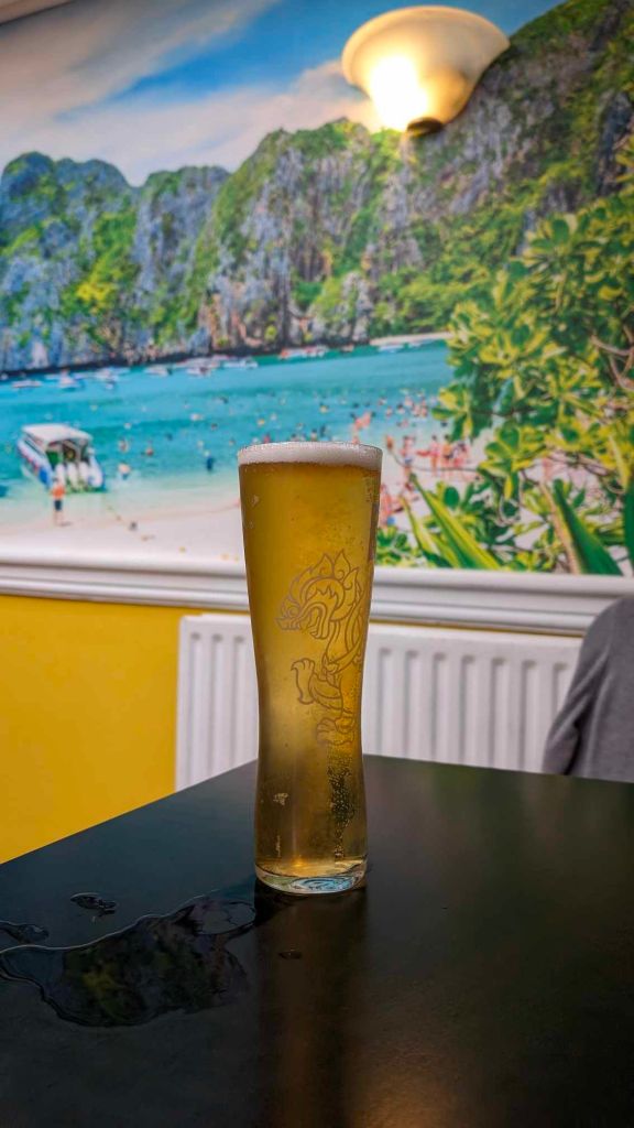 The restaurant is decorated in a tasteful Thai theme. I was quite taken by the wall sized picture of ‘Maya Bay’ which took me back to my time traveling across Thailand. They even served one of my favourite beers on tap, Singha. If you squint your eyes at the beer in front of the picture hard enough, it almost feels like you are on holiday! 🤣