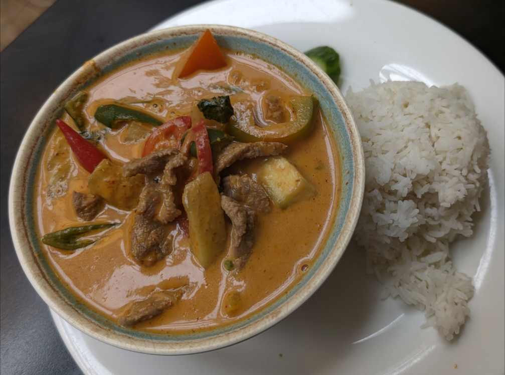 The menu has a fairly standard selection of classic Thai dishes, such as noodles, Thai curry, soups, stir fry, and salads. Under ‘chef specials’ I noticed a few duck dishes like the ‘Roast Duck In Tamarind Sauce’ and the ‘Honey Duck’ that I will be keen to try on my return. I noticed that the red Thai curry came with rump steak rather than regular beef, which I thought was a nice touch. I decided to go for that.