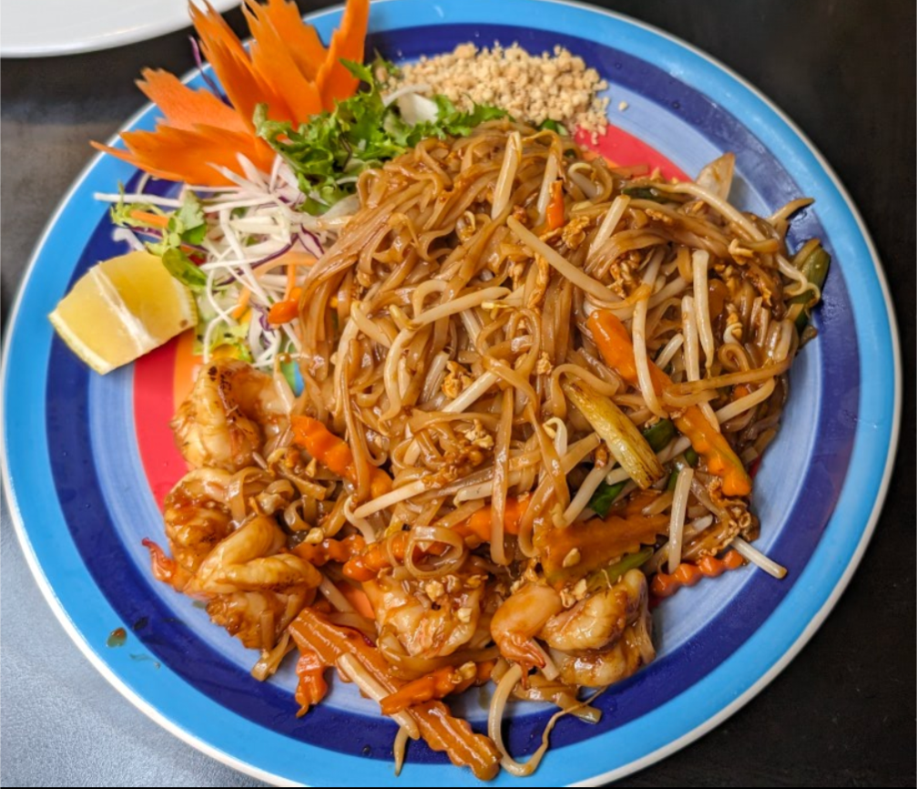 Next up was the pad Thai. This was beautifully presented with a garnish of salad which gave it a colourful pop. It is served with noodles, egg, spring onions, carrots, sprouts, and crushed peanuts.