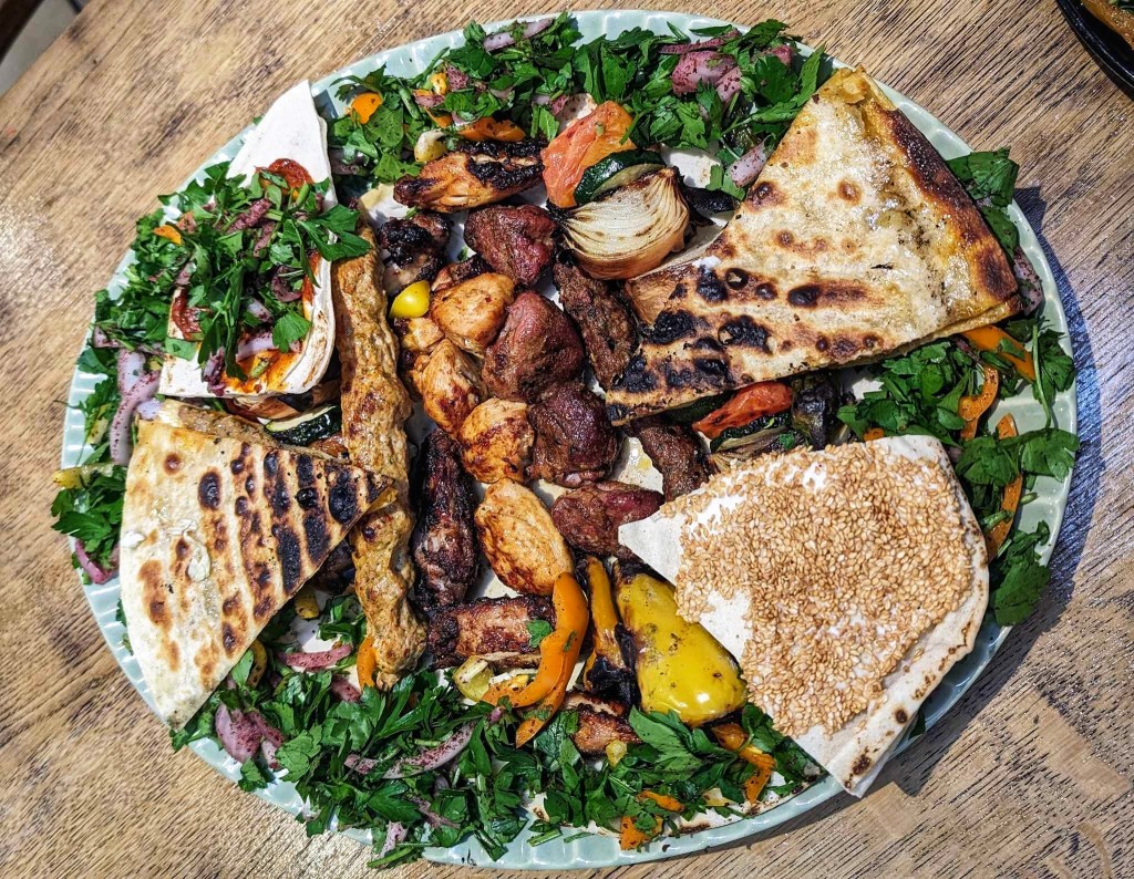We were both starting to feel quite full, then this monster was suddenly placed before us. This is the Damasbridge mixed grill platter for two and quite simply, has it all! It comes with skewered lamb and chicken shish, lamb kebab, arayes, and chicken wings. This is all served with chips, salad, bread, and grilled onions and peppers.