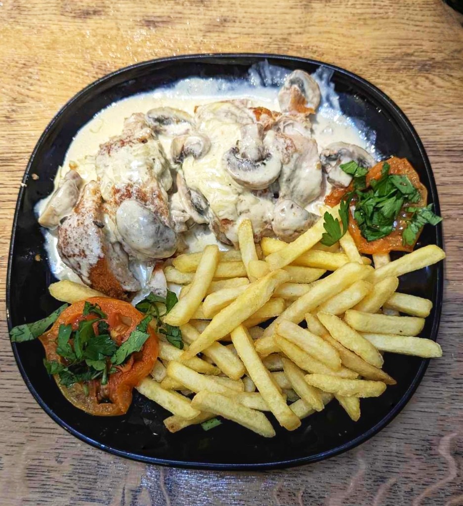 To make sure we were truly stuffed (good and proper) we were offered the chance to sample their ‘Damas chicken’. This is similar to the creamy chicken and mushroom French dish we all know and love. It consists of breaded chicken breast, stuffed with mushroom and cheese, all topped with a mushroom and cheese sauce (served with chips & grilled veg).