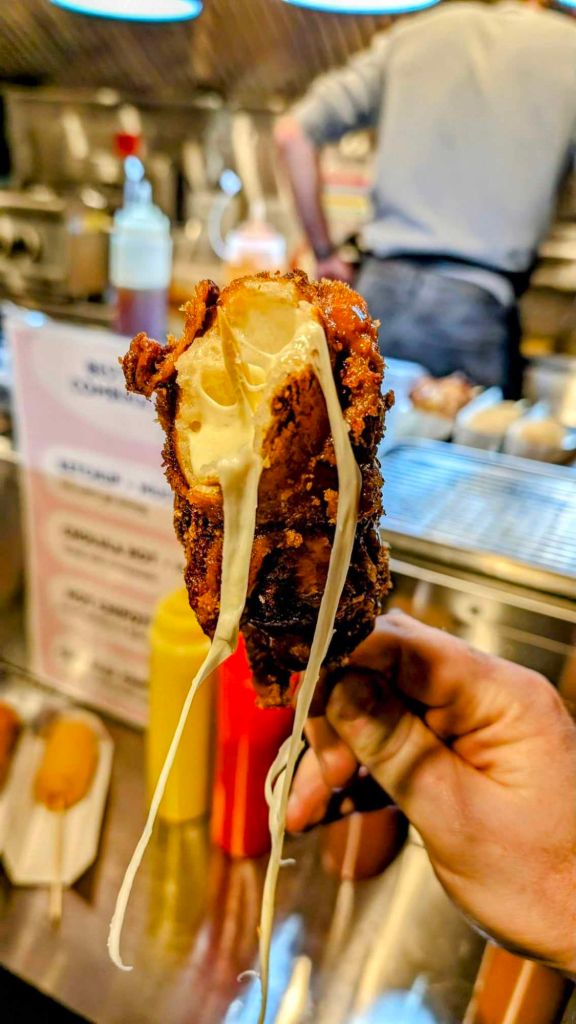 I ordered it as half and half, giving it a lovely stringy mozzarella top under a layer of crispy batter. This was then finished off with a frankfurter sausage at the end. I recommend the half and half as it makes the corn dog less samey throughout the entire experience.