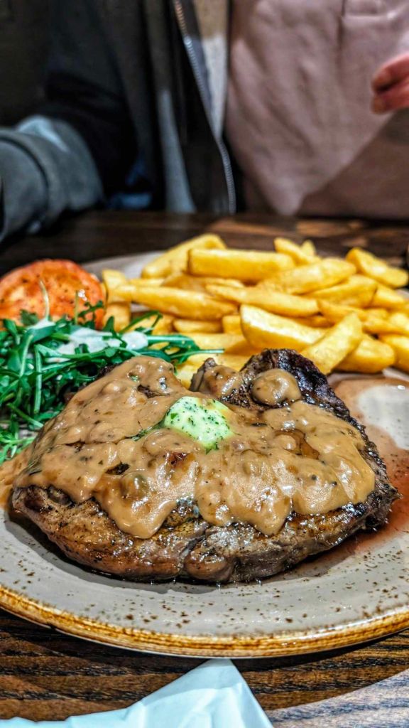 I was keen to try the 10oz grass-fed rib eye steak on the menu. Rib eye is my favourite cut of steak and being grass-fed is a real flex. We ordered it with peppercorn sauce with chips, a tomato, and a side salad.