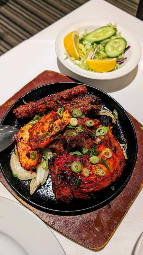 His dish was served on a sizzling hot plate with tandoori chicken, sheek kebab, chicken & lamb tikka, with a plain naan bread. This is then served with salad and mint sauce on the side.