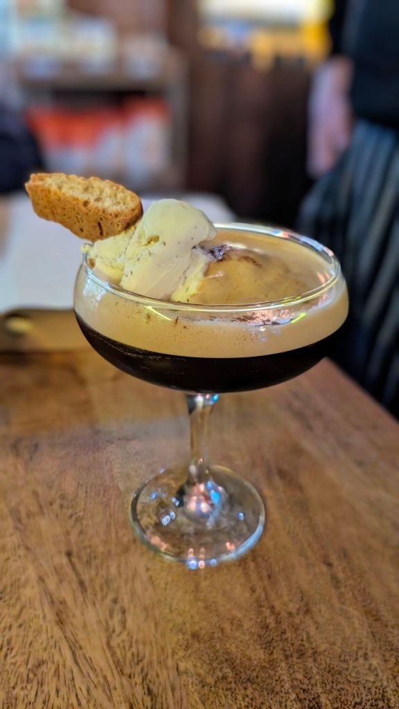 I was tempted by the Limoncello (as it is plastered across their sign out the front) but I couldn’t resist the sound of the Nutty Affogato from the cocktail menu. This is a frangelico coffee that is beautifully presented in a cocktail glass with a dark body and a frothy top. This is then signed off with a dollop of vanilla gelato and a biscuit.