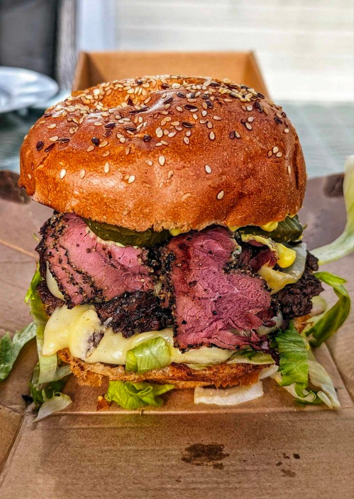 The New York Stack is a deli style burger that consists of two stack beef patties, mustard mayo, pastrami, nutty cheese, sliced gherkin, sauerkraut & lettuce.