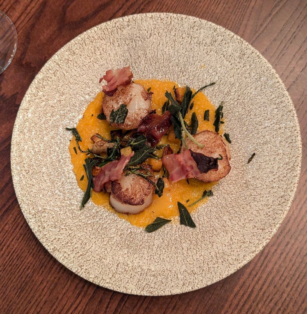 My guest had an incredible looking pan-fried scallop dish. This came served on a ceramic plate with roast butternut and pancetta. There were three scallops in total, which were all incredibly thick, juicy, and meaty.