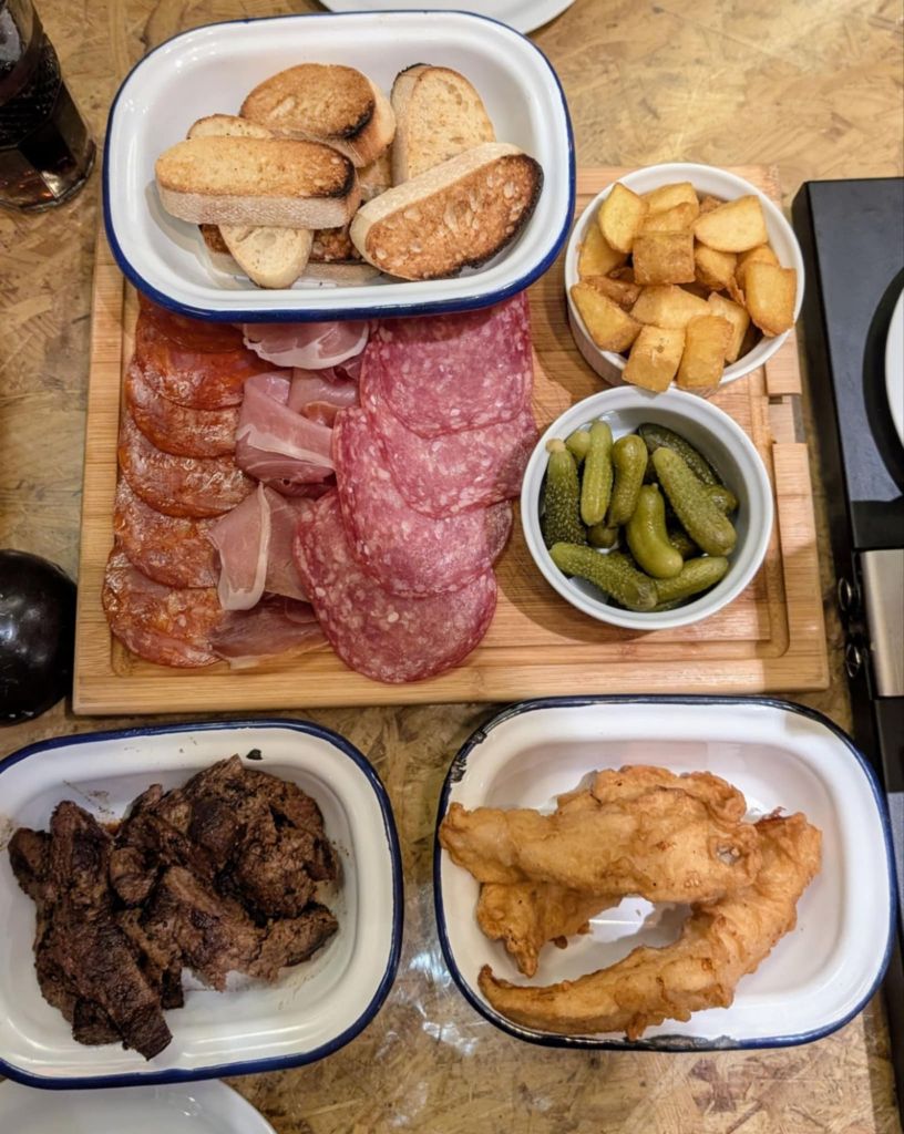 The spread comes with a selection of “award winning” cured meats, cornchicons, mini roast potatoes, and sourdough bread. You are given options to add steak (+ÂŁ6), crispy chicken and crispy prawns (+ÂŁ4). Since we missed out on the Alpen Cheddar, I decided to order the steak and crispy chicken.