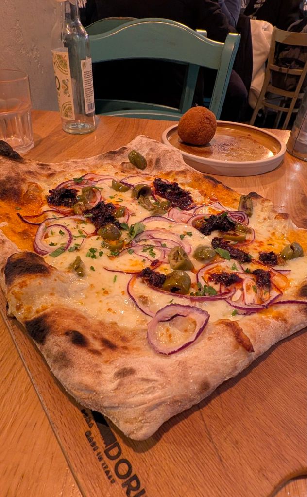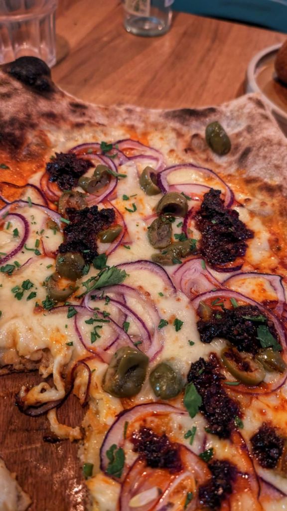 The base was incredibly light and delicate, allowing the toppings to dance uninhibited on your palate. The grilled olives were excellent and the onions were perfectly portioned to compliment the overall flavour, rather than dominate.