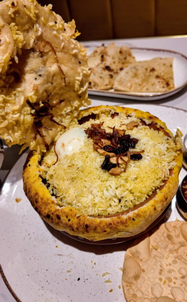 This dum biryani is made from kaima rice and layered with chicken on the bone, which is slow-cooked over a low heat. It is then presented with a selection of masalas (sauces) and a layered naan on top to seal in the heat and flavours. Unlike Bangladeshi-style biryanis, you won’t find a side curry here; instead, the dish prides itself on offering incredibly juicy rice which is created from the rich chicken juices that meld together during cooking. While it might appear dry at first glance, the opposite is true.