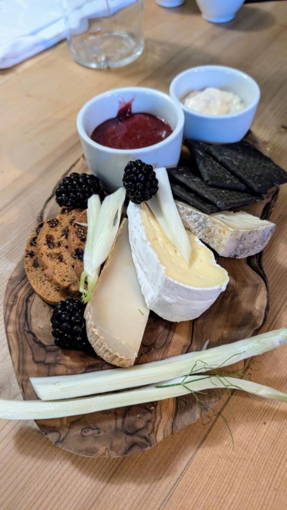 We ended with a lovely cheeseboard containing a selection of British classics, including Sussex Brie, British Blue, and Rachel Goats’ Cheese. Each cheese was a revelation of flavour and texture, truly showcasing the best of Britain, with the brie being the standout favourite. Four slate-shaped crackers and some sort of biscuit crackers were provided, but this felt inadequate for the amount of cheese, leaving us with about half our cheese without a canvas.