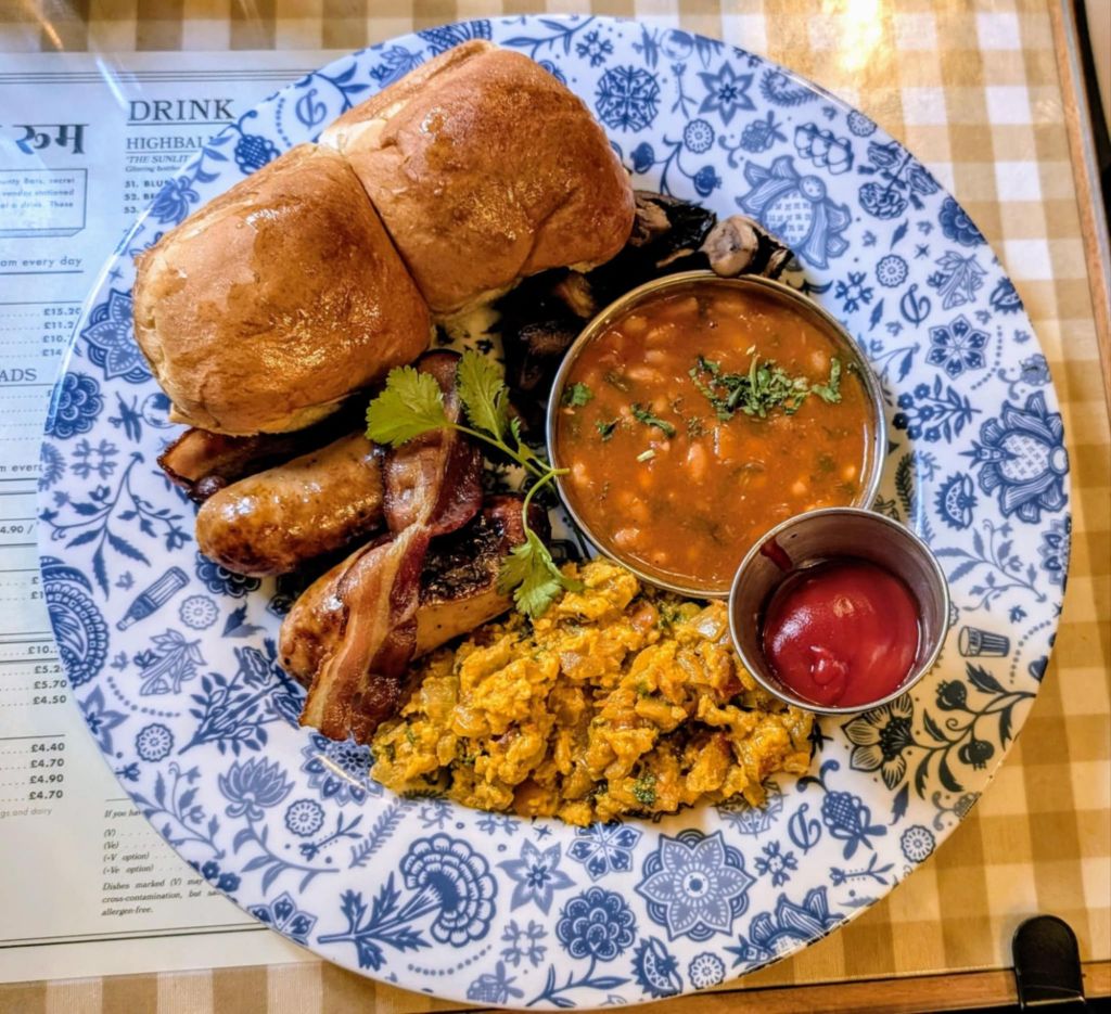 The akuri, a lightly spiced Indian scrambled egg dish, was a beautiful golden colour, made with free-range eggs from the award-winning St Ewe farm in Cornwall. The streaky bacon, from Ramsay’s of Carluke, a Scottish family butcher running for over 160 years, was perfectly cooked. The Shropshire pork sausages from Maynard Farm were soft, flavourful, and light – ideal for a breakfast meal. The homemade masala beans were lovely and the buttered buns gave you the freedom to make the breakfast your own, whether you want to use the buns for mopping up or turning it into a butty with the other ingredients.