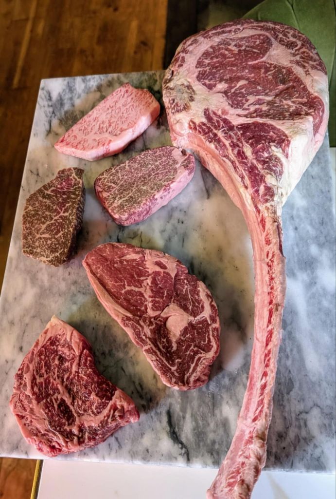 The waitress allowed me to oggle a selection of their steaks. Pictured below is a monstrous 4.5kg tomahawk steak (right), alongside Japanese A5+ Wagyu and Kobe, which have such prominent marbling you can barely see the flesh. Steaks from Argentina, Australia, Chile, and England were also available, all with a fantastic BMS (Beef Marbling Score) of 7-9 – You don’t get much better than this!