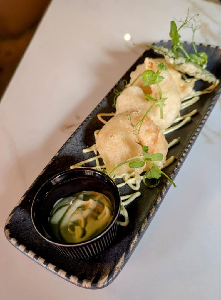 The waitress recommended the ‘Tiger Prawns Tempura’ served with Shiso and citrus mayonnaise.