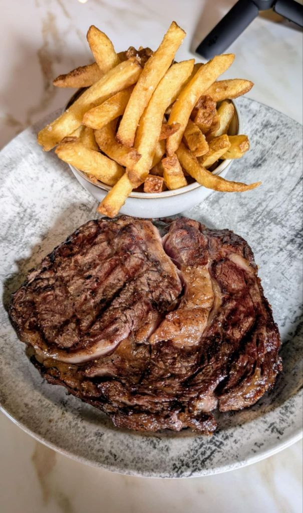 The main course options included rump and ribeye steaks, cod, chicken, and cauliflower (v). Although ribeye is my favourite cut, it came with an additional £9.50 charge. As it was an extra 75g compared to the rump steak, I simply couldn’t resist paying it.