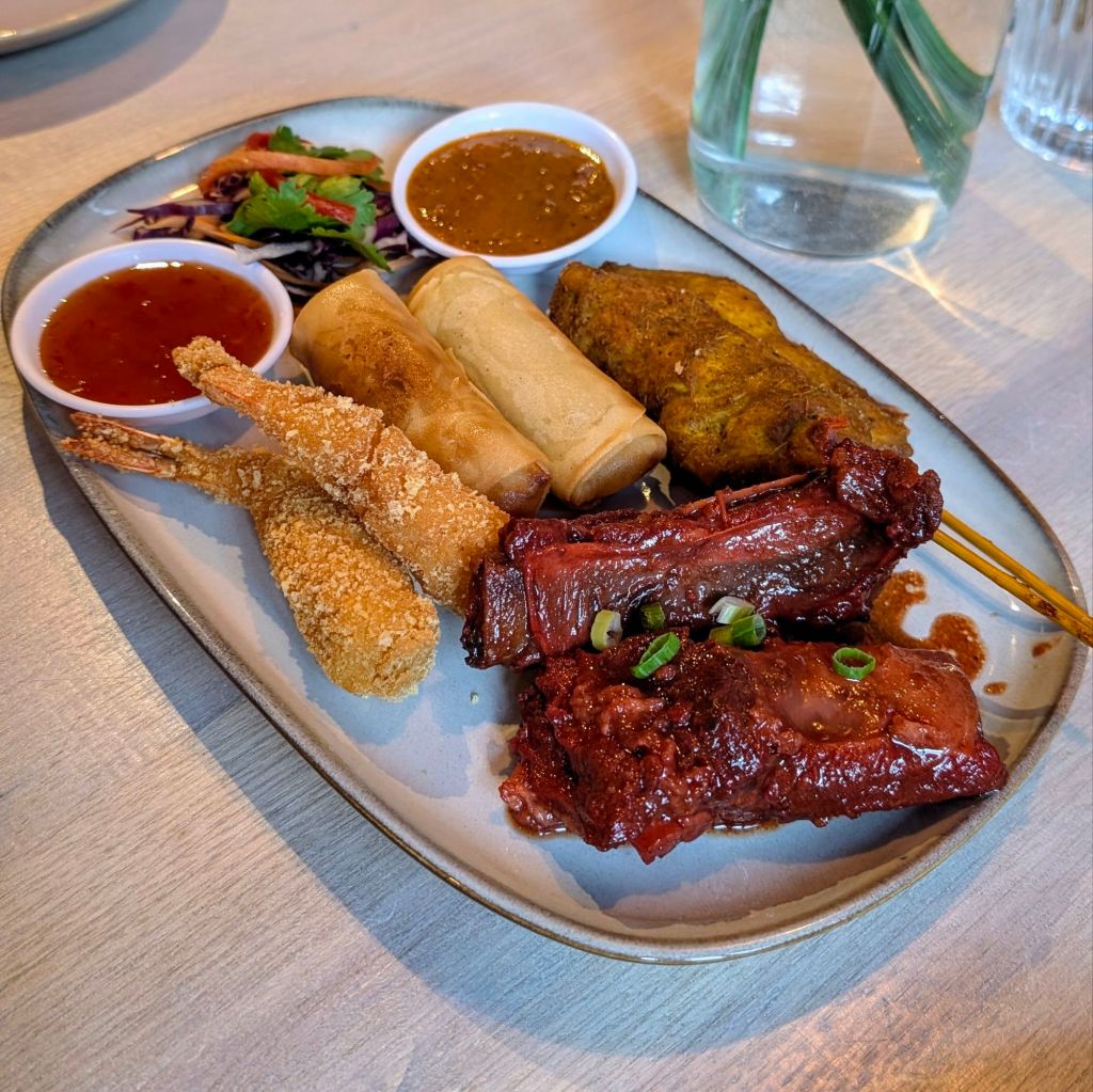 The Sharing Starter Selection arrived with chicken satay sticks, tempura prawns, pork ribs, and vegetable spring rolls. The pork ribs were a revelation and came in a beautiful red colour with a slightly spiced, sweet glaze, that gave way to incredibly soft and meaty pork. They were an absolute joy to sink my teeth into, though there were a few more bits of gristle than I would have liked. The chicken satay was equally impressive, sliding off the skewer with minimal effort. I’ll never know how they managed to make it so tender and soft while it was still firm enough to hold on. Delicious!