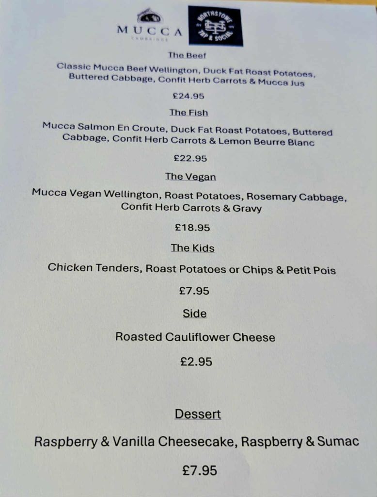 The menu, which required pre-ordering several days before my visit, offered a variety of wellington options, including beef, salmon, and vegan, alongside a cauliflower cheese side and a raspberry vanilla cheese dessert.