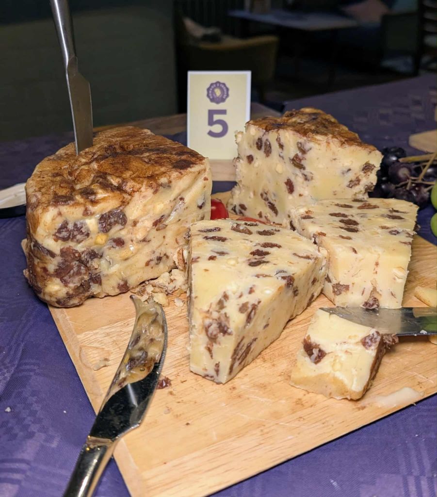 The most additives! Take a fabulous traditional Lancashire cheese – crumbly, tasty and delicious, then add apples, raisins and cinnamon until you get a cheese that is more like cake than cheese! (V+P)