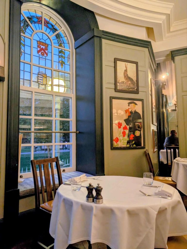 As you’d expect from the grand, historic exterior, the restaurant offers a traditional, old-English style and ambience. It feels cosy and atmospheric, with a mix of modern and historic artwork adorning the walls, each subtly referencing Cambridge. A fun, eccentric touch is found in the lavatories, where, instead of music, an audiobook of ‘Wind In The Willows’ plays on a loop. If your guest is taking a while in there, then they are probably just keen to hear what happens next!