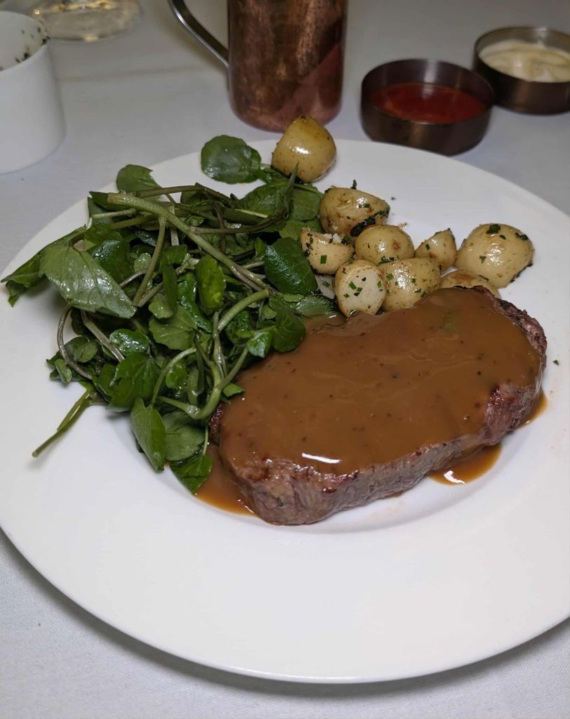 A small jug of thick, rich peppercorn sauce was provided alongside the plate, the portion being just right for the dish. The chips arrived in a separate pot, and, unexpectedly, a pot of baby new potatoes and herbs also appeared, adding a very welcome variety of carbs to the meal. By the time I had finished, I was pleasantly satisfied that 8oz was indeed enough.
