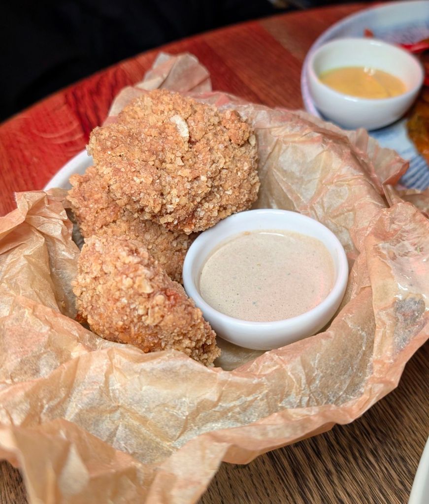 Finally, we tried a bowl of pork rind chicken nuggets served with a pot of black garlic ranch. These were everything you’d want from a nugget: big, crispy, and meaty. They were decent enough but failed to stand out in tonight’s vibrant display of dishes. The black garlic sauce was fantastic, though it couldn’t quite mask the slight dryness of the nuggets.