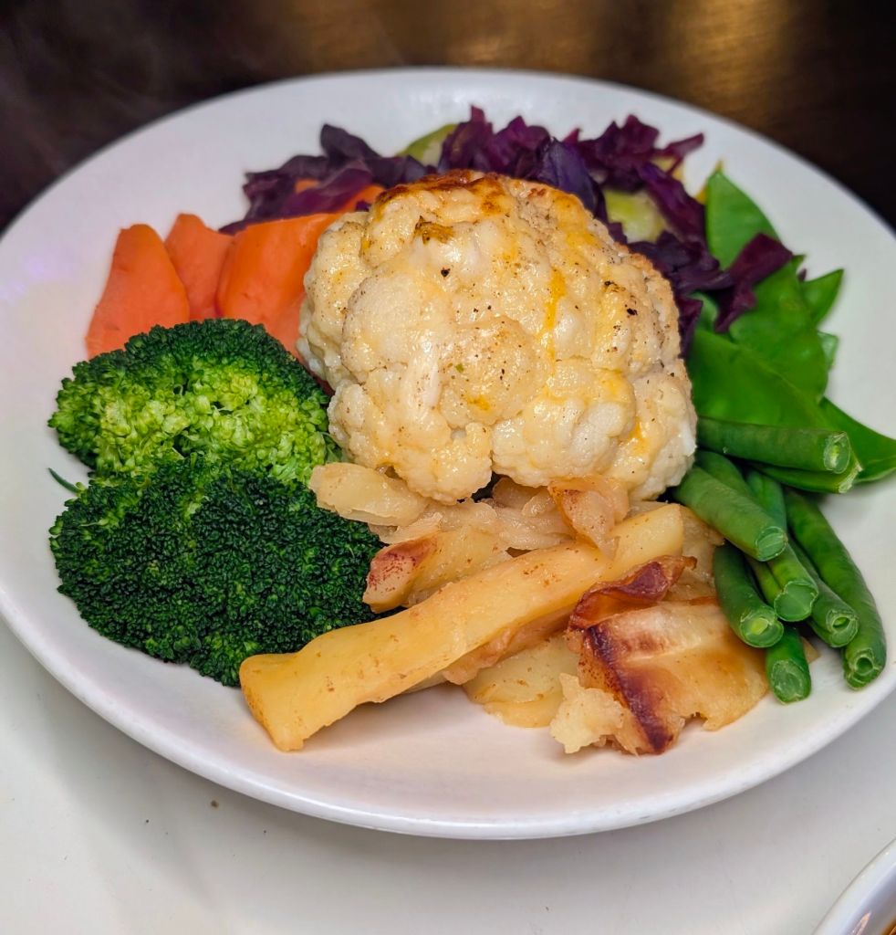 Once I added the vegetables, the plate looked far more impressive and vibrant. The mix included carrots, greens, cabbage, broccoli, cauliflower, and runner beans. Everything tasted fresh and of decent quality, though much of it appeared to be steamed, which was a slight disappointment for a premium roast.