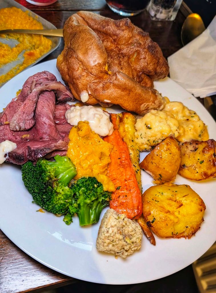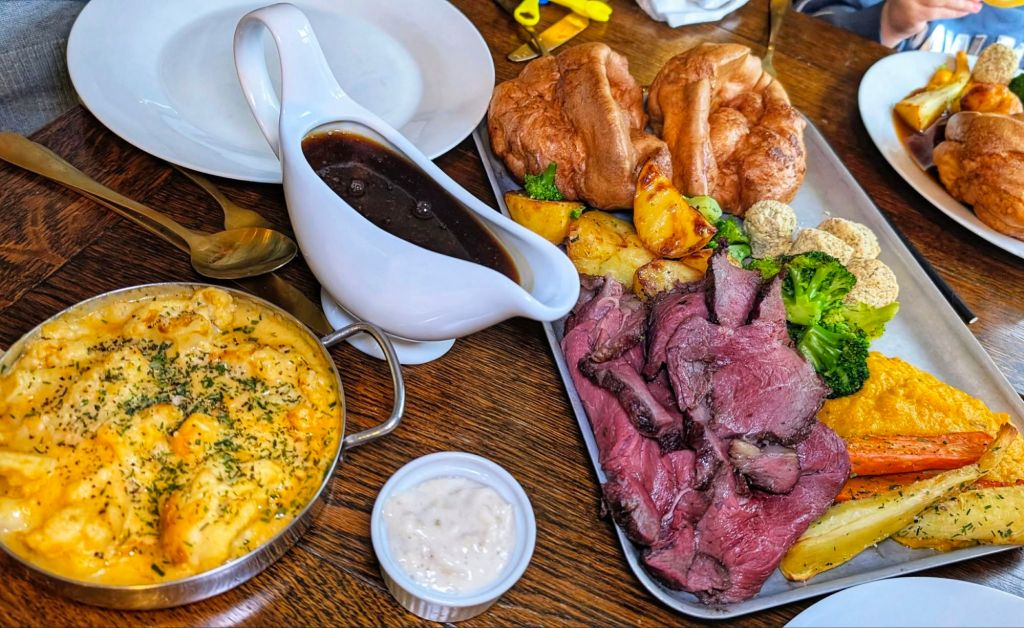 These are all served with beef fat roast potatoes, roasted carrots, parsnips, swede mash, smoked cauliflower cheese, sage and onion stuffing, broccoli, Yorkshire puddings, and “proper gravy.” It comes to £22.50 per person or £45 for a sharing tray for two people, making it a fairly standard price.