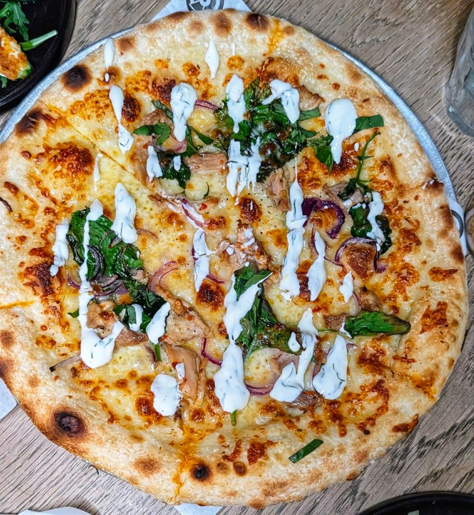 The lemon chicken pizza came with a garlic butter base rather than a tomato one. This made it feel more like a garlic bread type of pizza. This, along with this being my first time having lemon chicken on a pizza, made this a totally new concept for me…but it really worked. It had this lively, citrusy pop that was genuinely exciting and would have likely been overpowered by a tomato base. The dill yoghurt was sublime and added a nice creaminess to the texture that made the whole pizza complete. I would definitely order this again.